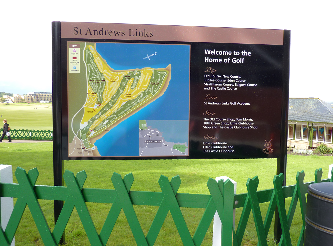 The brief was to simply create a signage system which would be easy for members and visitors to navigate around the links and that the design could translate and reflect the proud brand of St Andrews Links. The type of sign frame had to be carefully thought about depending on location, and was selected appropriately. The basic design of the signs were constructed using the St Andrews Links branding guidelines, where more intricate iconography and arrow design was constructed myself in the style which would represent the brand.